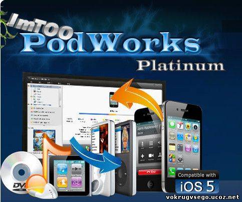 ImTOO PodWorks Platinum - это конечное ITunes-другое обновление с возможностью конвертирования DVD, видео и аудио файлов, таковых как AVI, MPEG, WMV, WMA и так дальше, в iPod файлы и передавать их на IPod/iPhone, производить резервное копирование IPod/iPhone файлов на комп,